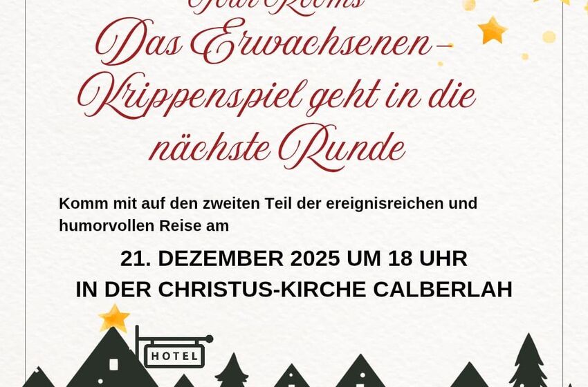 Wir laden herzlich zu unseren Gottesdiensten rund um Weihnachten ein. Erwachsenkrippenspiel 21. Dezember, 18.00 Uhr · Christuskirche „Die Liebe ist der Weisheit Anfang“ – eine warmherzige, ...