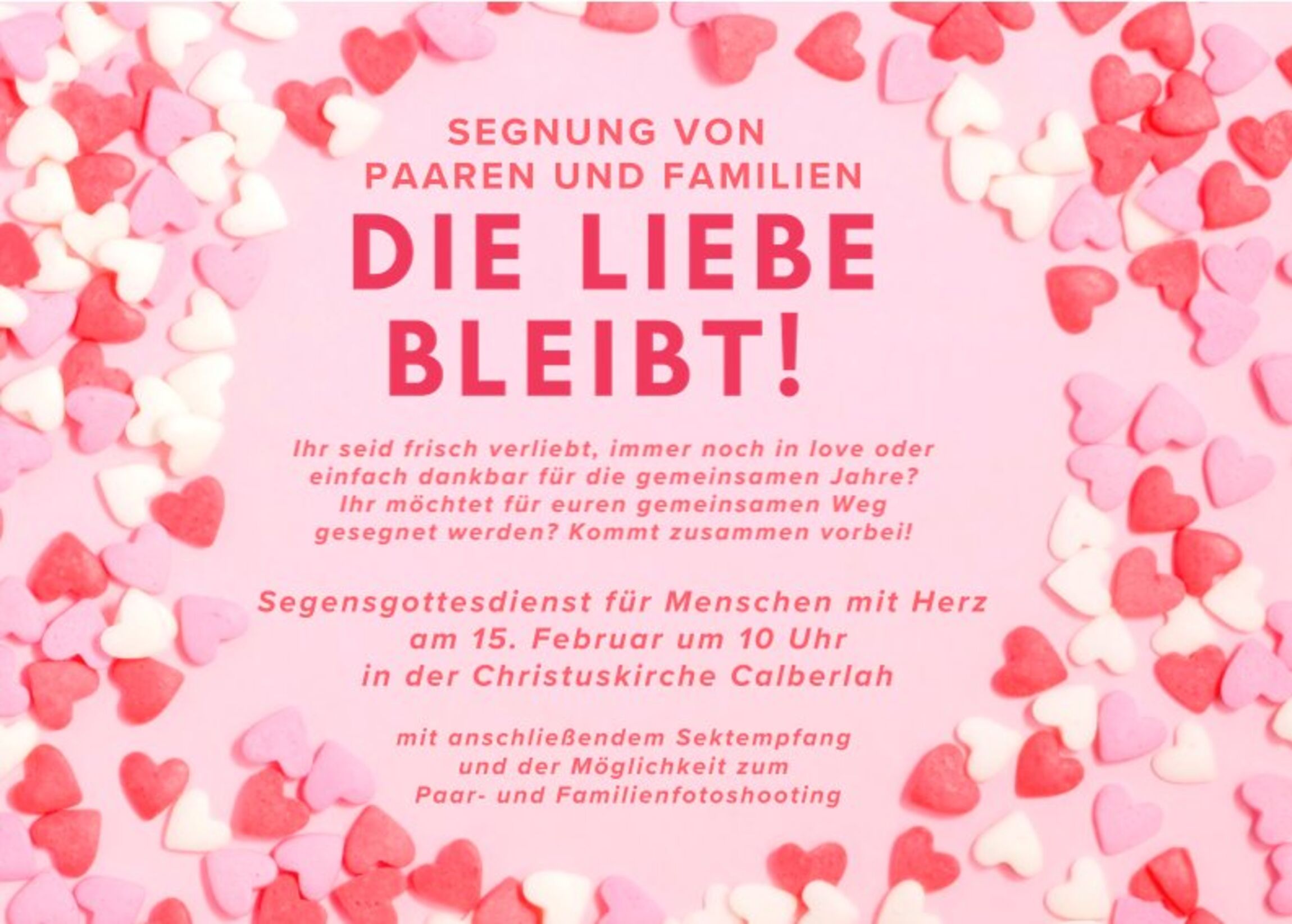 Segensgottesdienst für Menschen mit Herz am 15. Februar um 10 Uhr in der Christuskirche Calberlah - mit anschließendem Sektempfang und der Möglichkeit zum Paar- und Familienfotoshooting