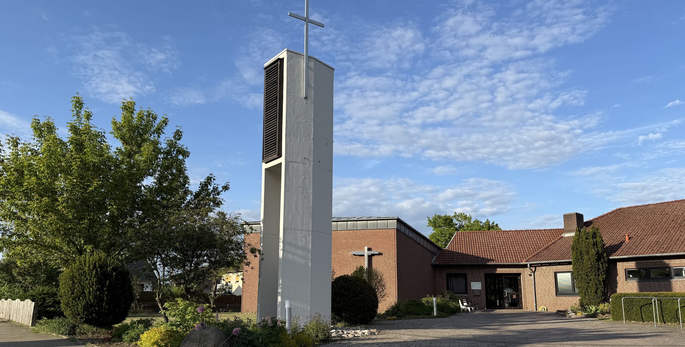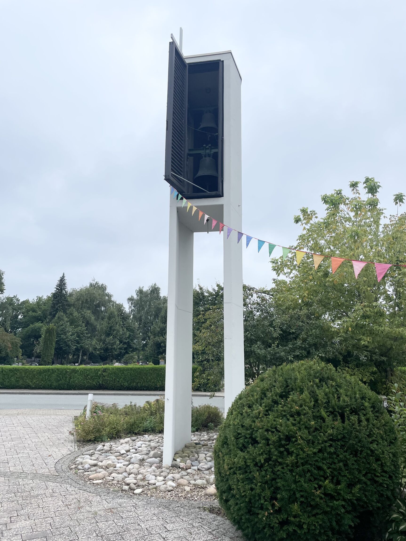 Die Grundsteinlegung erfolgte am 16.09.1973 im Rahmen eines Gemeindefestes. Die alte Stundenglocke der Alten Kapelle wurde zum Gemeindezentrum transportiert , um die Grundsteinlegung mit ihrem Glockenklang zu begleiten. Anfang 1974 konnte schließlich mit dem Bau des Glockenturms begonnen werden und schon am 18. August 1974 konnten die Bronzeglocken aus Heidelberg geweiht werden. Die Einweihung des Turms wurde ebenfalls mit einem Gemeindefest mit rund 400 Menschen gefeiert.