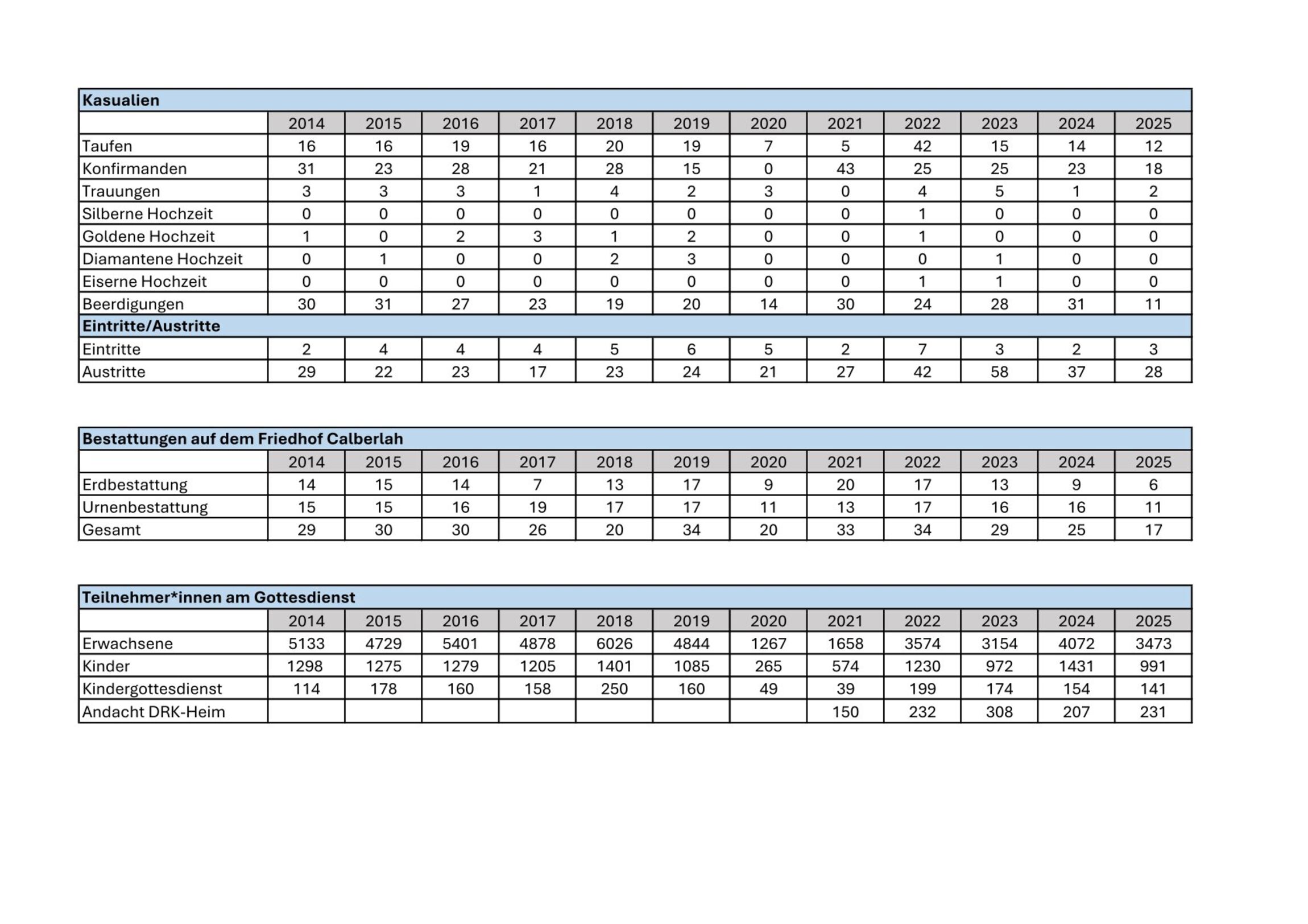 Unsere Jahresstatistik gibt einen Einblick in das vielfältige Leben unserer Kirchengemeinde. Sie fasst in Zahlen zusammen, was das Jahr geprägt hat: die Anzahl der Gottesdienste und ihrer Besucherinnen und Besucher, Taufen, Konfirmationen, Trauungen, Bestattungen, Jubiläen sowie wie Kircheneintritte und Kirchenaustritte.